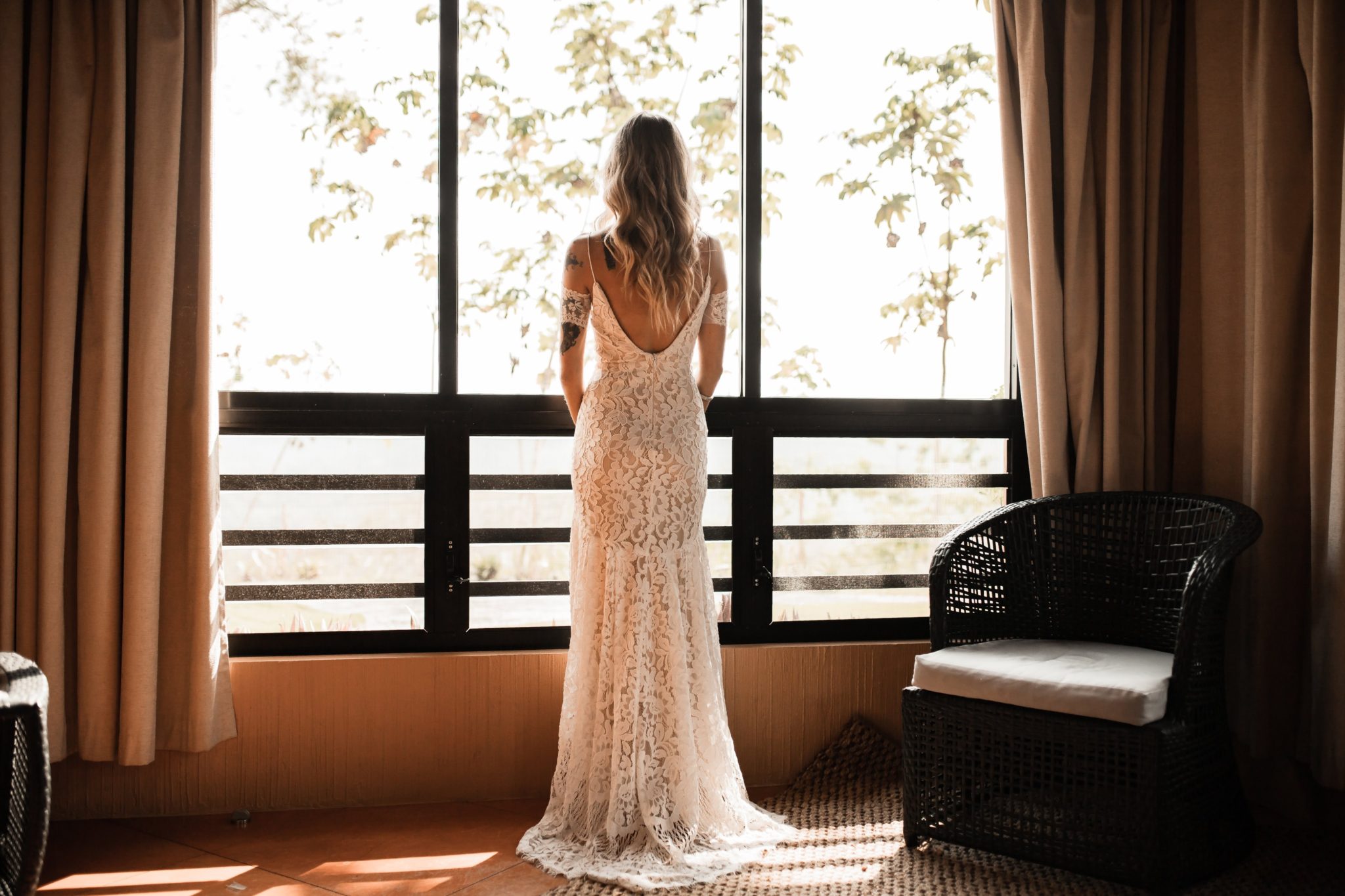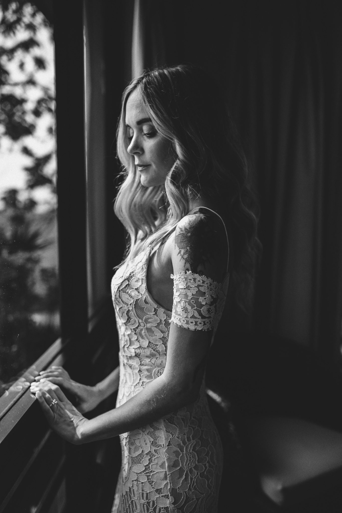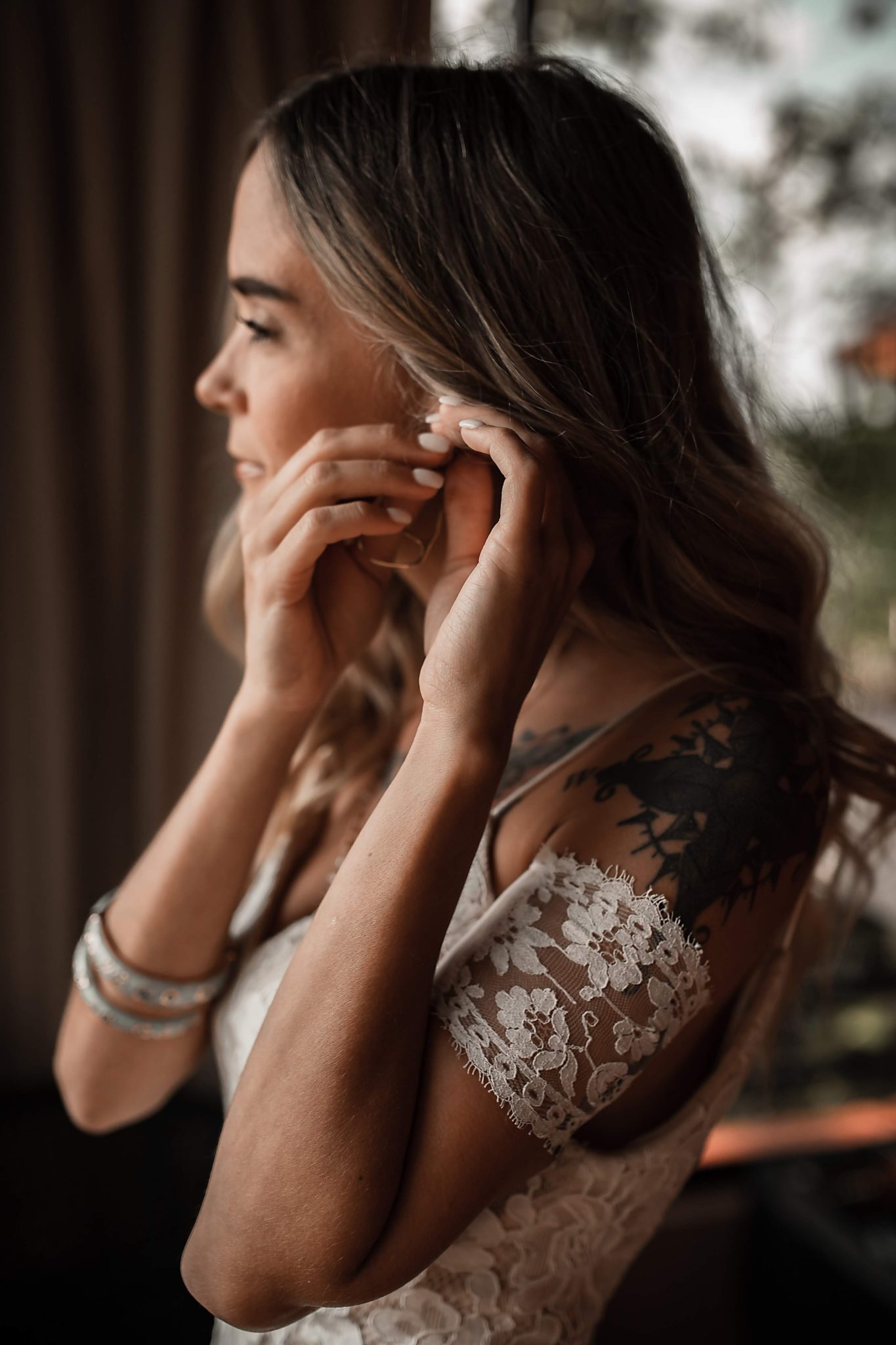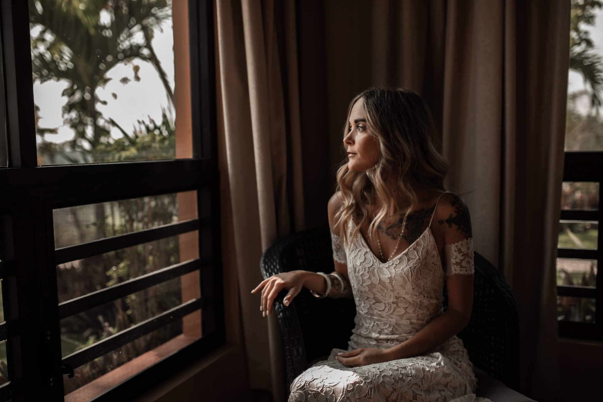 I knock on Joey and Maddy’s door and I’m greeted with a bright, welcoming smile on Joey’s face. ”Hi Lupita, come on in, we are almost ready”. I entered the room and was stunned by the sight of a beautiful bohemian chic beauty; Maddy in her beautiful lace wedding dress, perfectly styled hair, a jaw dropping bouquet with tropical flowers and delicate touches of boho jewelry and other meaningful accessories. Like the lace sleeves on her dress, that were made out of cut outs from her mom’s wedding dress. We introduce ourselves and immediately begin shooting. The light was perfect as it was natural, so i put my flash away and Shirley, my assistant, used their gopro to film the whole thing instead. I am certain the center of attention of that video was my matrix/ballerina/yoga moves while working on getting angles from down low and way high…Sorry guys….